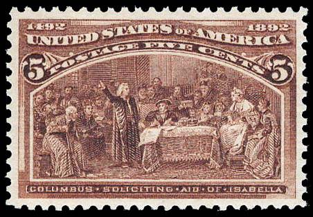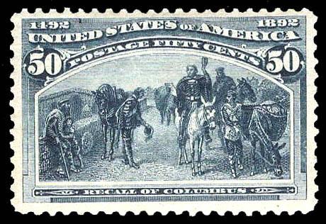 1893, 50¢ Columbian (Scott 240), attractive centering, o.g., hinged, almost Very Fine. Scott $450. Estimate $200 - 300. Scott $450 Suggested Bid $200-300 (Image)