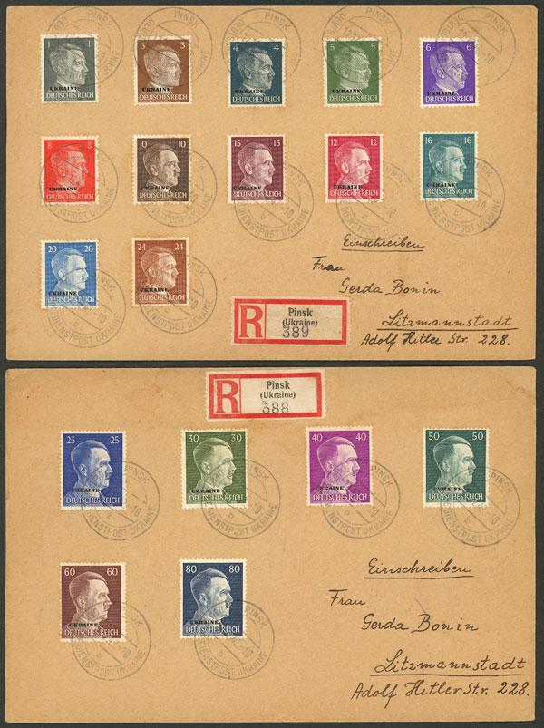 2 Registered cover sent from Pinsk to Litzmannstadt on 12/DE/1942, franked with stamps of the issue (18 values) with the image of Hitler overprinted "UKRAINE", we also include 3 fragments with similar stamps, VF! (Image)