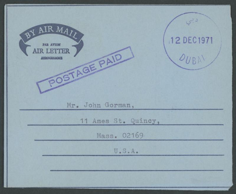 AEROGRAMMES: 1971 usage of British-pattern Apsley formular Air Letter with superb boxed 'POSTAGE PAID' cachet and on the reverse 'DIRECTOR OF POSTS/POST OFFICE/DUBAI' cachets in violet, to Massachusetts USA with typed letter "PHILATELIC SECTION/GENERAL POST OFFICE/DUBAI (A. GULF)" that states "...we are not yet in a position to issue...aerogramme[s] at present", very fine bi-lingual '.../12DEC1971/DUBAI' cds in violet. The UAE formally came into existence on 2.12.1971. However, Terry Jones' earliest recorded date for usage of a UAE aerogramme is '20OCT1972'. (Image1)
