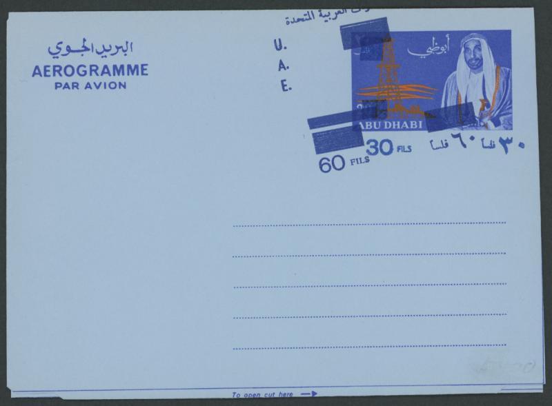 AEROGRAMMES: 1973 '25 FILS' on '30 FILS' on Abu Dhabi 20f Oil Industry as Jones UAL2 but with unlisted Grossly Misplaced Surcharge, unused. Superb. Note that the UAE overprint has eight elements. (Image1)