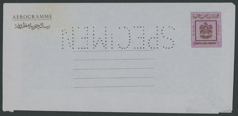 AEROGRAMMES: 1974 Heraldic Falcon 60f Jones UAL4 two examples with the address panels only punctured 'SPECIMEN' (Inverted & Reversed) size 33x6mm (stained on the rear panel only) or 103x20mm. Very scarce.