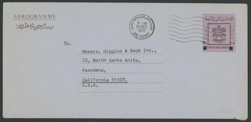 AEROGRAMMES: 1977 commercial usage of '75' (fils) on 60f Jones UAL5 Sub-Type 6 to California USA with bi-lingual '.../28DEC/1977/UAE-DUBAI' machine cancel, the letter requests information about the Higgins & Gage postal stationery catalogue. (Image1)
