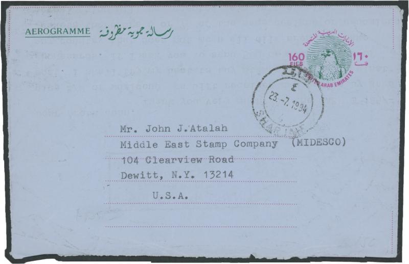 AEROGRAMMES: 1994 commercial usage of New Design 160f Falcon unlisted by Terry Jones (despite his book being dated 1998) to New York USA with 'Deira Dubai' return address and bi-lingual '.../23-7.1994/SHARJAH' cds. Fascinating social commentary: "...All schools closed up to end of Sept and all hotels vacant. No tourist coming. Most of Locals and Expats gone to their country. No public on roads during daytime. Looks like curfew in city..." How things have changed in only 30 years. (Image1)