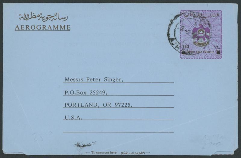 AEROGRAMMES: 1999 commercial usage of 1989 Heraldic Falcon '160' (fils) on 75f Jones UAL8 commercial usage to Oregon USA with Ajman return address and bilingual '.../9-9-90/AJMAN' cds. (Image1)