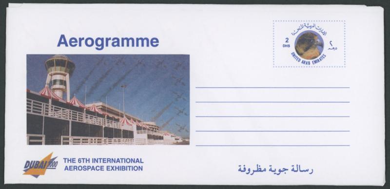 AEROGRAMMES: 2000 2dh Falcon scenic issue for 6th International Aerospace Exhibition with views of the Airport on both sides, unused. Superb. This form weighs more than a standard envelope and was probably not intended to be postally used! In fact, no commercial usage has been recorded by us. Apparently, this was the last UAE issue. (Image1)