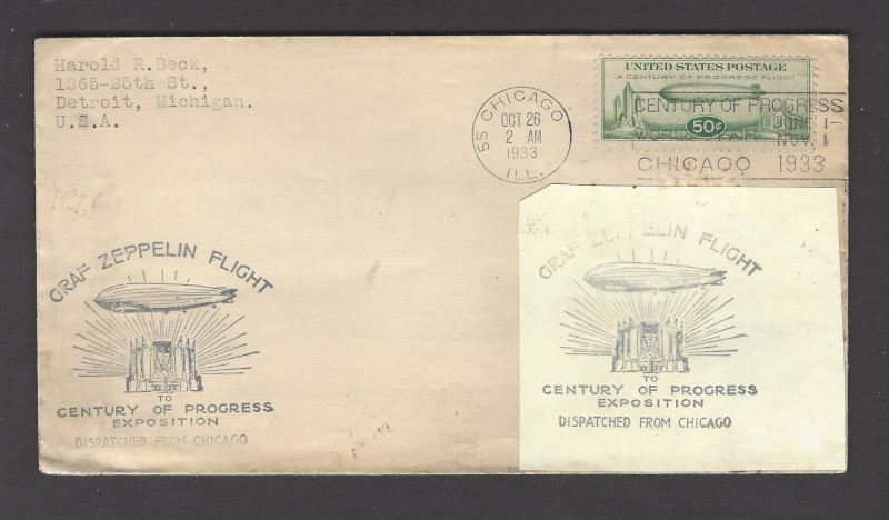 C18 Tied on Cover with "Century of Progress", Chicago 1933 Cancel + Oct. 26, 1933 C.D.S., Received in Friedrichshafen (Nov. 2, 1933), Then New York on Nov. 18, 1933, Original Addr. is Covered Up, Generally Sound Cond., F-VF, SCV is $80.00 (Image)