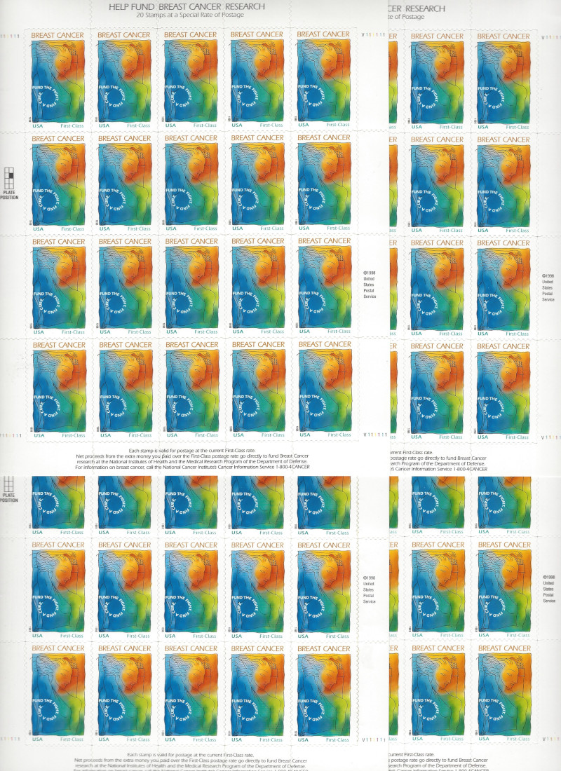 B1, B2, Ten Cmpt. Mint Sheets of Each, 1998 "Breast Cancer Research" and 2002 "Heroes of 2001", Sound Cond., MNH, VF, New Issue Cost was $170.00, Face Value Today is $292.00 (73 c. First Class Rate) (Image)