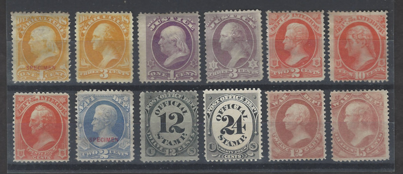 O3 // O90, O1S, O36S, 12 Diff. Stamps, 1873-75 Issues, Unused, No Gum, Two are Specimens, Generally Sound Cond., F-VF, SCV is $902.50 (for No Gum) (Image)