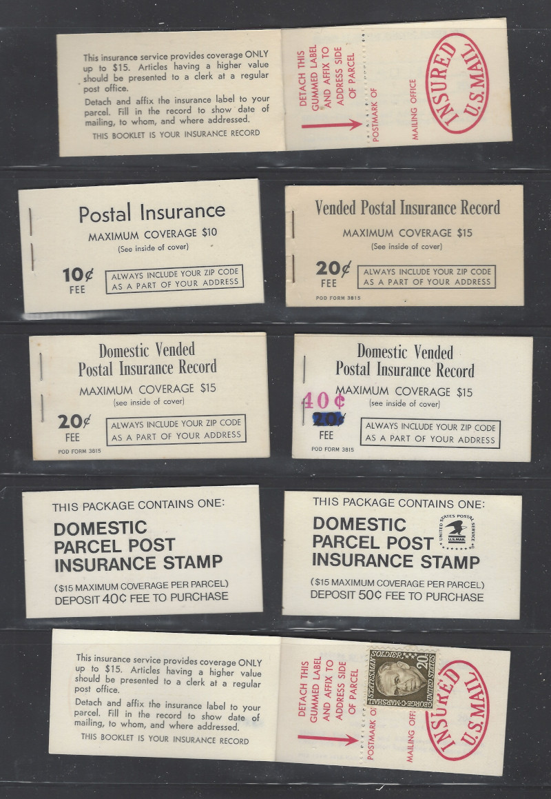 QI1-QI4, "Postal Insurance Stamps, Six Diff. Cmpt. Vended Bklts. (Each With One Stamp), Includes #QI2 (Type I & II) + #QI2 Revalued to 40 c. (With Added 20 c. Stamp), Sound Cond., MNH, OG, VF, Includes 2 Extra #QI2 for Illustration Purposes, SCV is $185.00 (Image)