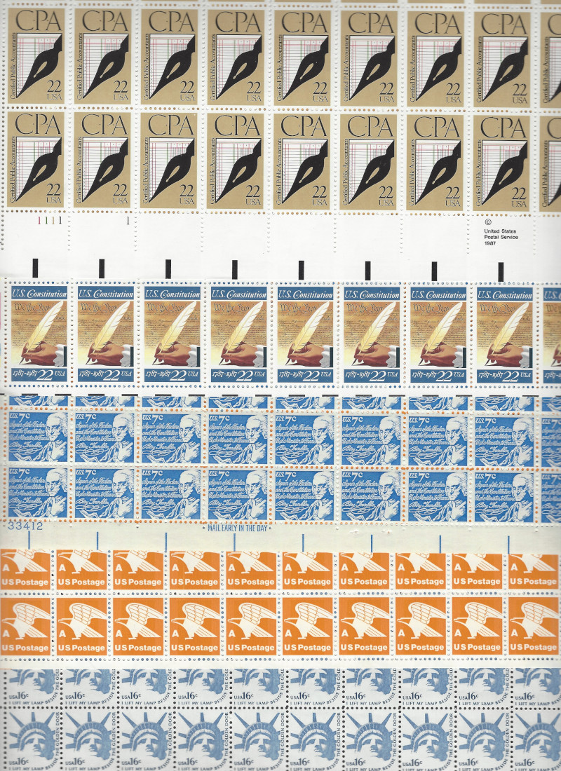 ACCUMULATION, 38 Cmpt. Mint Sheets + 1 Sheet with Selvage Removed, Regular & Commemorative Issues, Values Up to 22 c., Also Includes $2.98 in Postage Due Stamps (Not Counted in Total Face Value), Includes Duplication, Generally Sound Cond., Mostly MNH, F-VF, Face Value is $230.52 (Image)