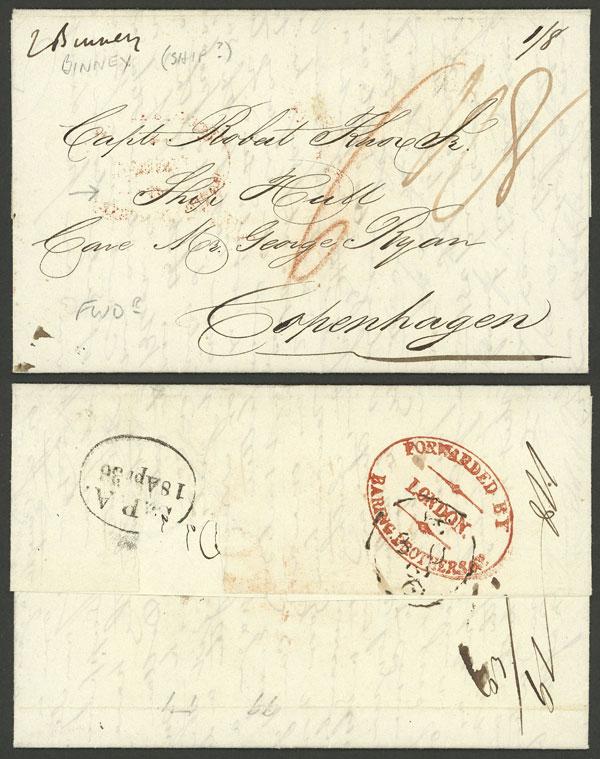17/MAR/1837 BOSTON - "Suip Hull" in Copenhagen, with red oval backstamp: "FORWARDED BY BARING BROTHERS & CO. LONDON" and several other marks on front and back, VF quality! (Image)