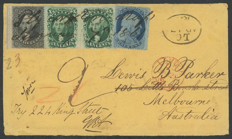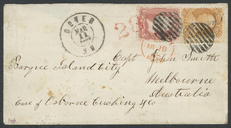 1865 (Mar 11) cover to Victoria with 3c deep pink (very fine) & 30c orange (poorly-centred but very fine) tied by superb bars-in-circle cancels of 'DOVER/NH'' (cds alongside), light 'BOSTON BR PKT/PAID' backstamp in red, London transit of MR28/65 & '28' (credit to GB) both in red on the face, very fine Melbourne arrival backstamp of JU-6/65 in blue, very minor blemishes. Ex Dale Forster. Addressed to "Capt John Smith/Barque Island City", an American vessel that had been involved in court action in the States in 1855. (Image1)