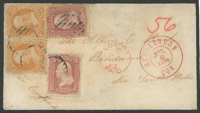 1862 (July 8) double-rate cover to New South Wales with very scarce franking of 3c deep pink x2 (one with perf faults) & 30c orange horizontal pair (rounded corner at upper-right) all with bars cancels of 'NEW LONDON/CON' (cds in red alongside), 'BOSTON BR PKT/PAID' backstamp in red, London transit of JL21/62 in red on the face, part-Sydney backstamp of SP11/1862 & 'BRAIDWOOD' arrival of the next day, minor flap faults & light blemishes on the face. Ex Dale Forster. (Image1)