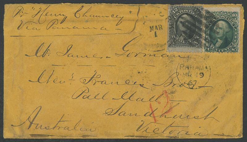 1867 (Mar 1) cover to Victoria "Per Henry Chauncey/Via Panama" with 10c dark green & 12c black (straight-edge at left) tied by New York datestamp, British 'PANAMA/MR19/67' transit on the face & '12' handstamp in red for credit to GB, the reverse with Sydney cds of MY1/1867, Melbourne of MY7/67 in blue & framed Sandhurst arrival of the same day, overall soiling. Ex Dale Forster. By rail from Colon to Panama City, then by New Zealand ship 'Kaikoura' ex Panama 25.3.1867; arrived Auckland 25.4.1867 & Sydney 1.5.1867. (Image1)