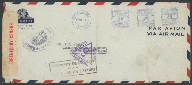 1940 (Feb 1) commercial airmail cover to "Vanikoro Santa Cruz Group/British Solomon Islands" paid 80c by New York meter cancels, missent trans-Atlantic with Spanish '.../19FEB40/SEVILLA' arrival backstamp, large 'CENSURA MILITAR/[arms]/BARCELONA' cachet on both sides & boxed 'PENDIENTE DE CENSURA/A/CENSURAR EN DESTINO' (= pending censorship: to be censored at destination) cachet on the face, returned then trans-America & trans-Pacific with Hong Kong arrival backstamp of 7AP/40 & Censor '9' cachet in violet, then per BOAC feeder service to Singapore & QANTAS to Sydney where censored, finally by sea to destination, repaired on the reverse from being opened roughly & multiple creases ironed-out. The rate to Australia was 70c, plus extra for surface mail to the Solomons; presumably missent because of "Santa Cruz" in the address. (Image1)