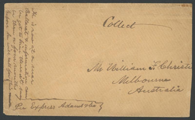 POSTAL HISTORY: 1850s (undated) stampless cover to "Melbourne/Australia" endorsed at lower-left "Per Express Adams & Co" with no postal markings, extensive instructions added on the face "...now at or near Ballarat...it may be...months before he will call for this mail" and on the reverse "Let this remain in the office at Melbourne until sent or called for..." and in another hand "Advtd" (= Advertised), minor blemishes. Rare & unusual 'post restante' express company cover. Ex Dale Forster. (Image1)