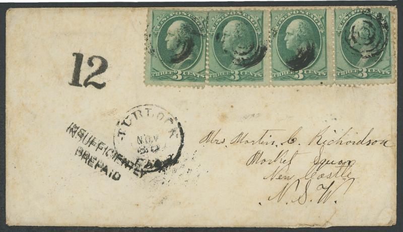 POSTAL HISTORY: 1875 (Nov 30) trans-Pacific cover to New South Wales with 3c green single & strip of 3 with target cancels of 'TURLOCK/CAL' (cds below), assessed as overweight with 'INSUFFICIENTLY/PREPAID' handstamp & superlative strike of the '12' handstamp of San Francisco, Sydney transit of JA7/1876 & Newcastle arrival of the next day, minor blemishes. Ex Dale Forster, who advises that provided one rate was pre-paid, only the additional postage was required with no penalty, NSW retaining the second 12c/6d. Early example of underpaid Treaty mail from San Francisco. (Image1)