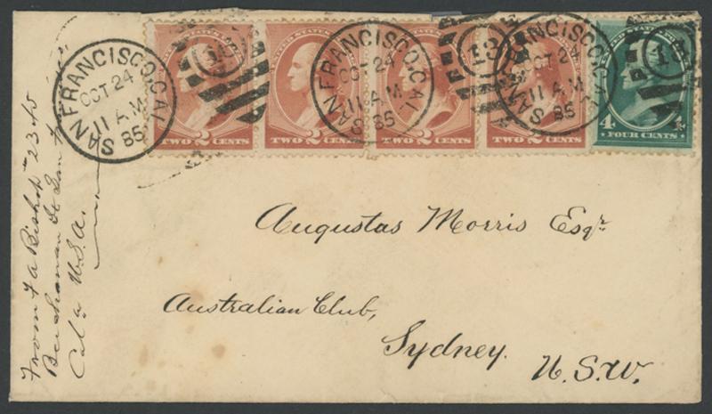 POSTAL HISTORY: 1885-88 Trans-Pacific mail to New South Wales at the 12c Treaty Rate comprising 1) 5c Envelope uprated with 2c brown + 5c sepia from Seattle; 2) with 2c brown x4 + 4c green from San Francisco; 3) from a wholesale druggist in New York with 5c only, fragment of Deficient Postage label on the reverse, 2c + another 5c added the next day; and 4) 5c Envelope from 'HECKATOO/ARK' with 'Short Paid' in rosine & mss "Due 7c", 'DEAD SECTION/ST LOUIS MO' backstamp in rosine, no evidence of the fine being paid but Sydney arrival backstamp of JA10/89; minor blemishes. Ex Dale Forster.