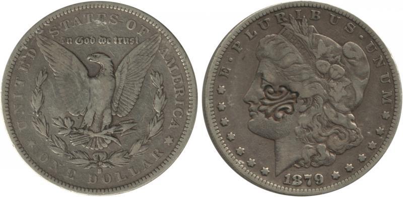 PUERTO RICO: 1879 $1 morgan (KM 110) counterstamped with Fleur De Lis, VF. Rare. In 1884 Puerto Ricos custom houses countermarked a large number of holed coins to legitimise them, Krause lists US Trade Dollars (KM 108) countermarked but not Morgan dollars. Sold 'as is'. (Image1)
