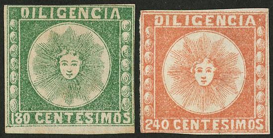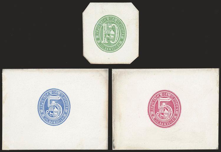 Die proofs of the stamps for envelopes issued in 1866 with spelling mistake (CENTECIMOS), 5c. in dark sky bue and rose-red + 10c. green, the 3 of excellent quality, rare lot! (Image)