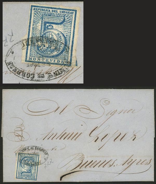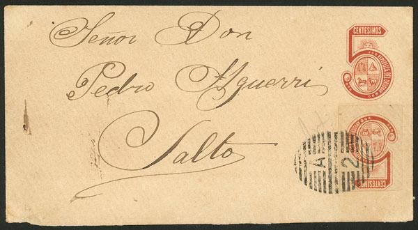Ciardi ST5 envelope + additional postage of 5c. (cut out from a similar envelope) cancelled by semi-mute "A-2" barred oval to complete the 10c. rate, sent to Salto, excellent quality, rare, ex-Loeb (selling price was US$2,500) (Image)