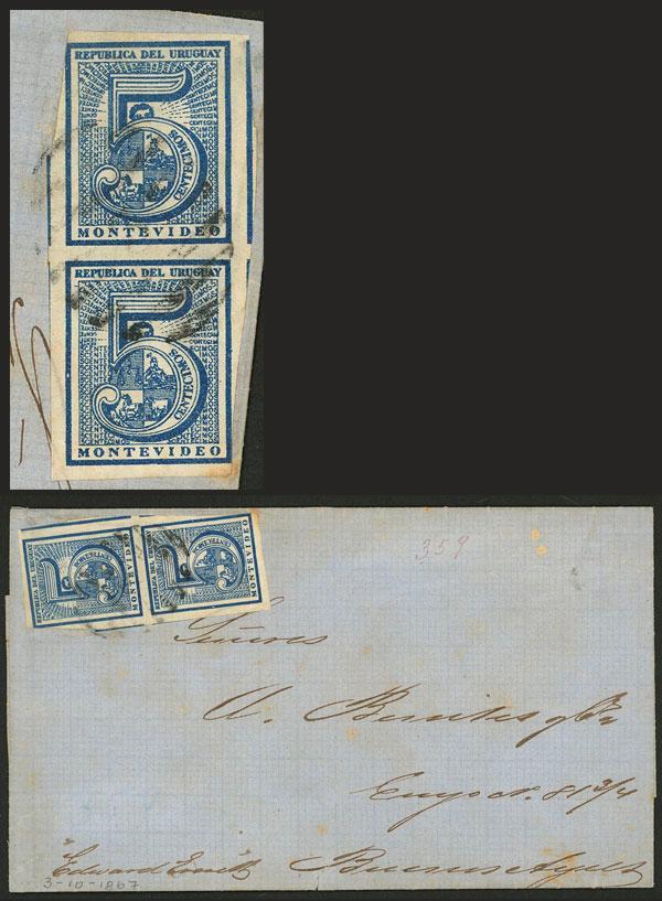 3/OC/1867 Montevideo to Buenos Aires, entire letter franked with pair of 5c. (Sc.30) with mute cancel, very fine quality! (Image)