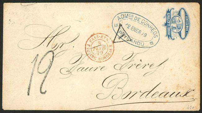10c. Stationery envelope sent from Paysandú to France on 12/JA/1879, with due marks and Bordeaux arrival, very fine quality, ex-Loeb (selling price was US$450) (Image)