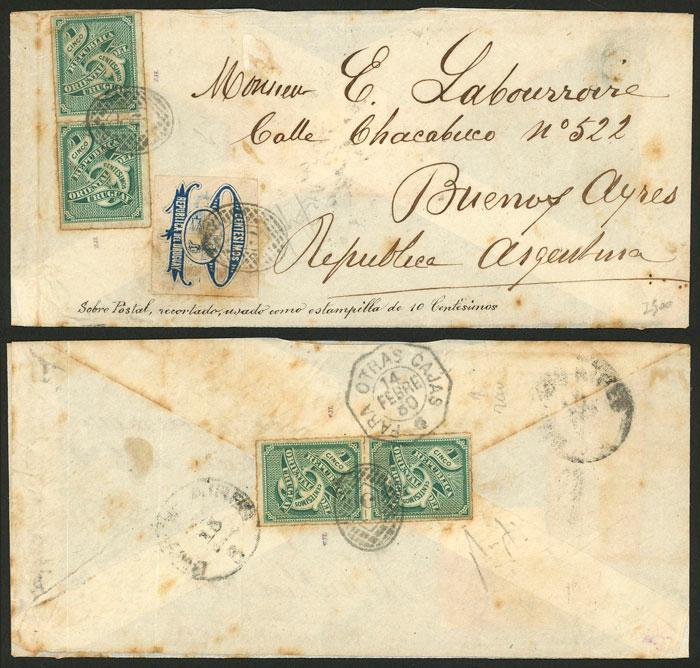 Large part of a cover sent from SAN JOSÉ to Buenos Aires franked with 30c. including 2 pairs of Sc.40 + a cut out from 10c envelope, all with numeral "5" cancels, also an octogonal mark "PARA OTRAS CAJAS" for 14/FE1880 and arrival of the following day, very interesting and rare, ex-Loeb (selling price was US$2,500) (Image)