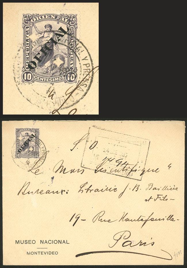 Official cover sent by the National Museum from Montevideo to Paris on 24/JA/1905 with official postage of 8c., arrival backstamp, excellent quality, Ex-Loeb (selling price was US$175) (Image)