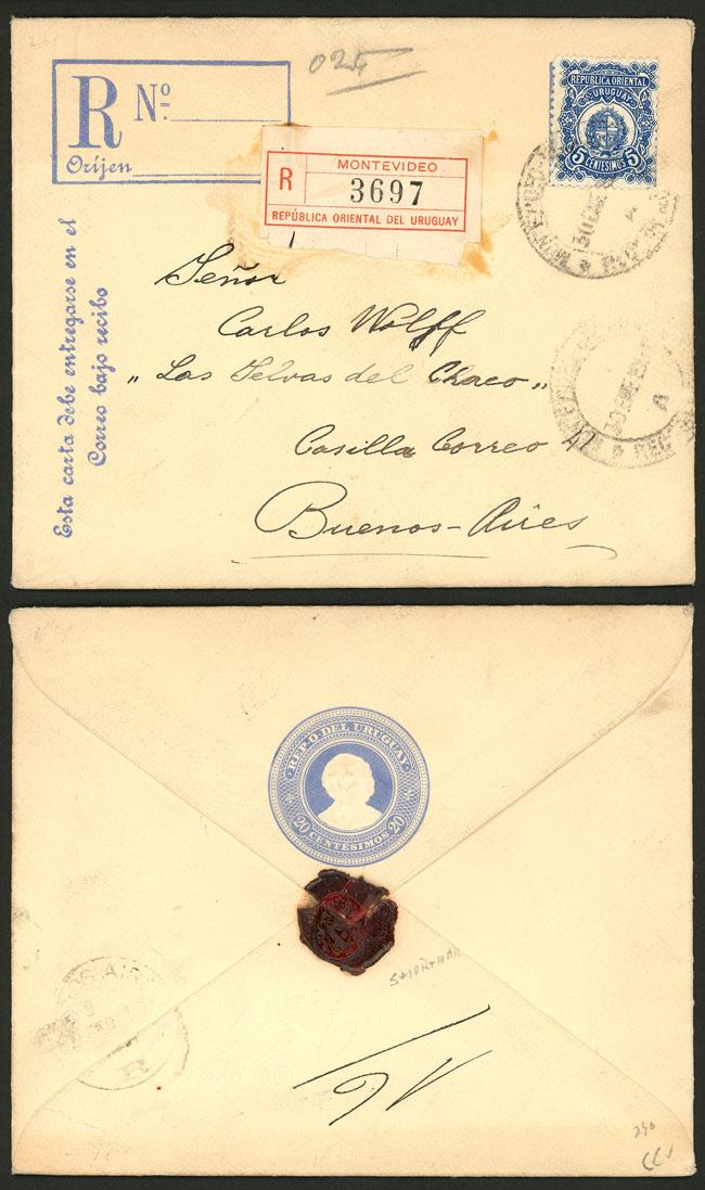 Stationery envelope for registered mail + additional 5c., sent from Montevideo to Buenos Aires on 30/JA/1907, excellent quality, ex-Loeb (selling price was US$250) (Image)