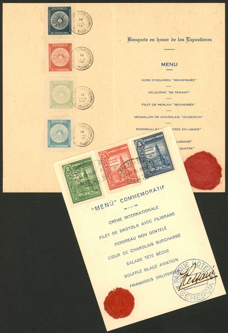 2 Dinner menus of the Parque Hotel of the philatelic expositions of 1927 and 1931, both with stamps affixed, excellent quality! (Image)