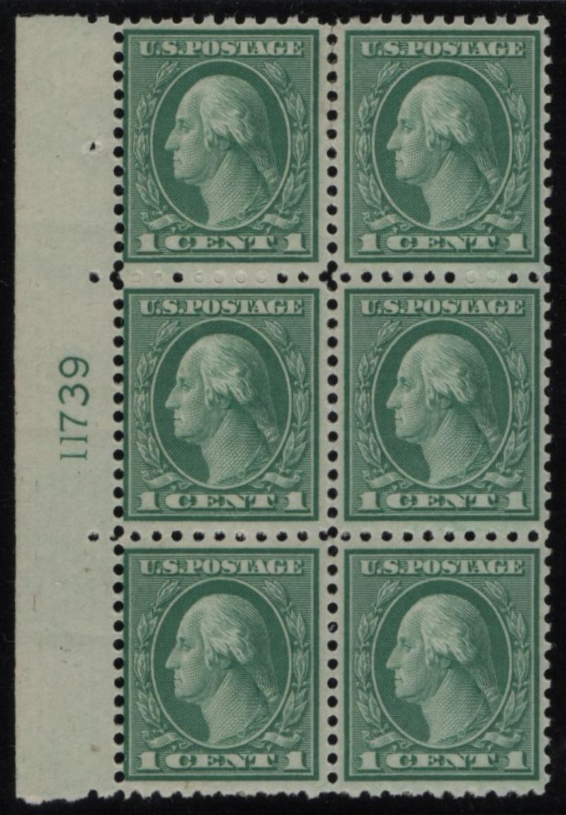 434 VF NH, Margin Block/6, 11¢ dark green Franklin, natural SE at right w/ arrow & line (Image)