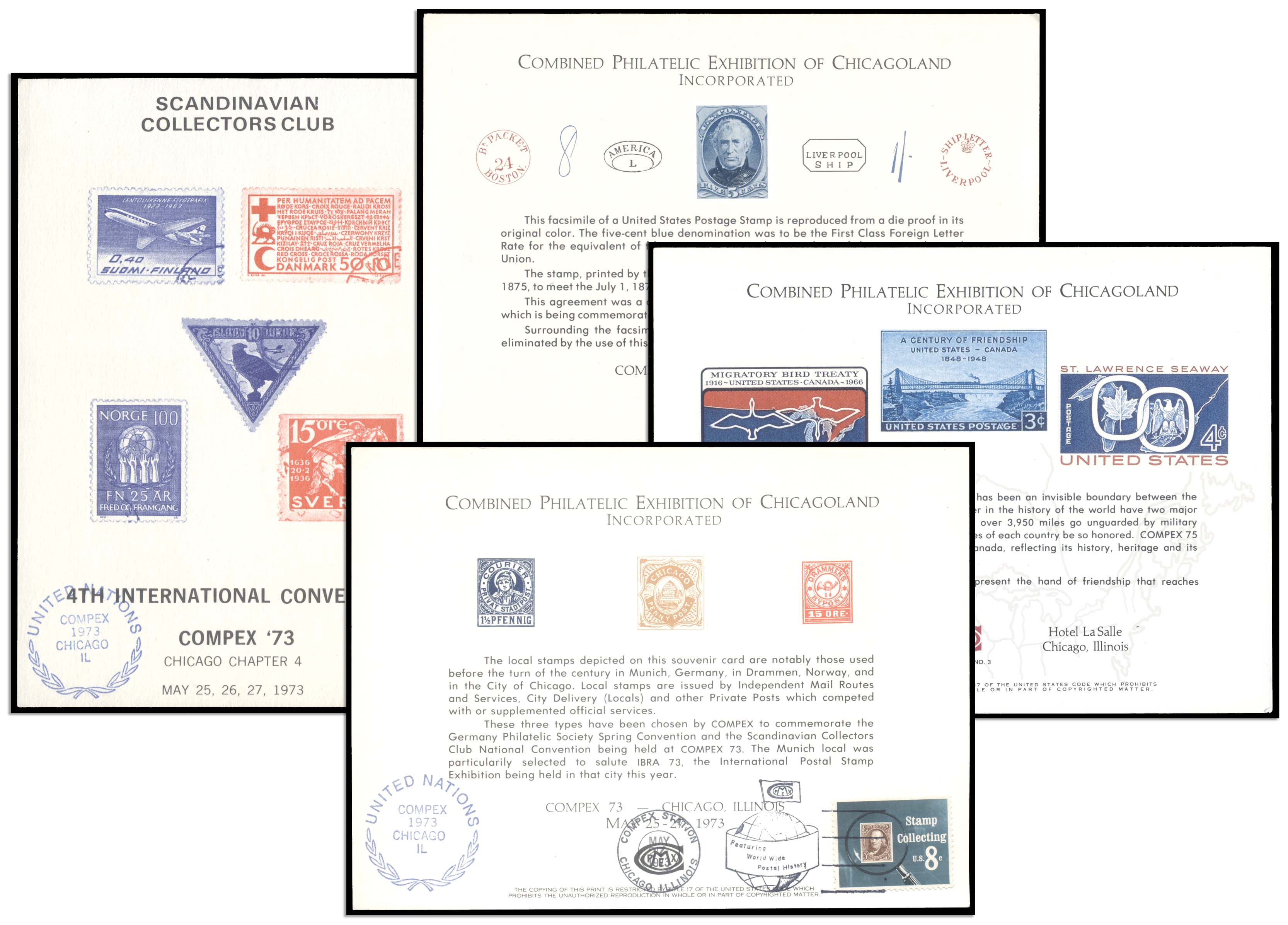 Collection Remainders of Philatelic,Souvenir Cards (41), includes USPS philatelic cards, UN souvenir cards, ASDA cards, and COMPEX cards. Most are mint, though several have show cancels or FDOI cancels. For UN (SC3//25), USPS (SC15//118), Stamp Dealers (ASDA 7//41 and C1, 3 - SCCS numbers). All in good condition, with a few tiny dinged corners and a couple are toned. Nice presentable group Cat($102) (Image)