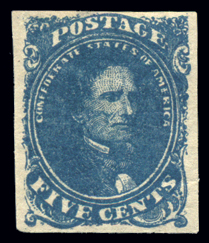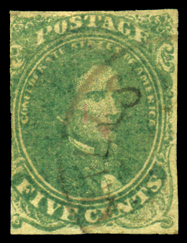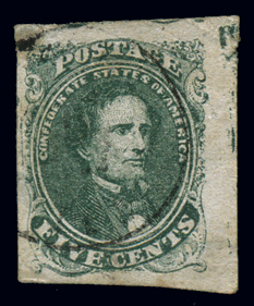 CSA 1c,5¢ Olive Green, four margins with couple small thins at top corner creases and light cds ccl; it shows bottom of stamp above it, extra vertical line at left with partial letter and at right it shows various lines along edge with apparently "FU" at upper right. Needs research. Dietz shows a variety with "SA" at left and line below "5" from Plate 2. Needs research Cat($200) (Image)