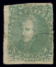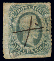 CSA 12cvar,10¢ GREENISH BLUE, UNOFFICIALLY ROULETTED 11 AT LEFT AND RIGHT, Fine with ms and cds ccls, possibly Richmond with some clipped perfs Cat($375) (Image)