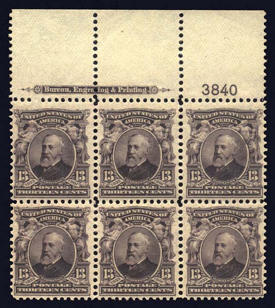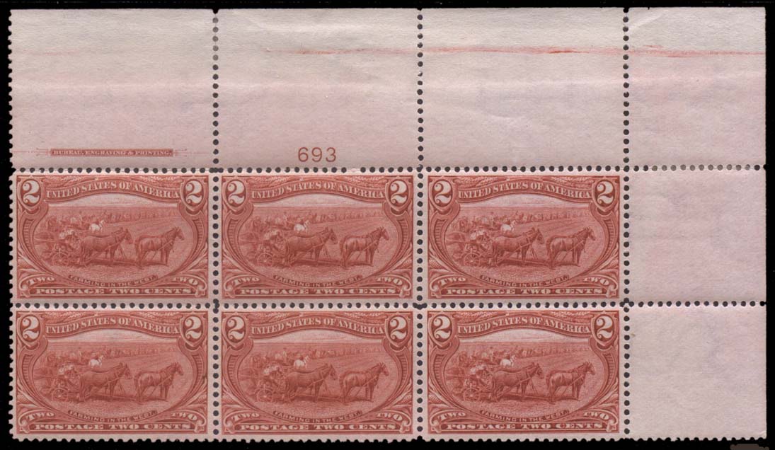 286,2¢ Trans-Mississippi, Upper Right Plate Block of 6 no. 693 and Bureau Imprint, VF OG, hinged in margins, all stamps NH, fresh rich color Cat($500) (Image)