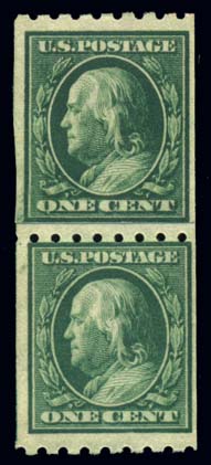 390,1¢ Green, Vertical Paste-up Pair, F-VF NH, but has fog on upper stamp, and the paste-up tab has part of the marginal arrow Cat($22) (Image)