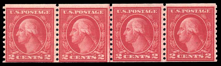 455,2¢ Carmine, Ty III, Coil Line Strip of 4, Fine NH Cat($141) (Image)
