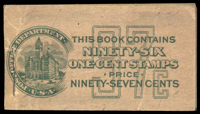 498e,1¢ Green, Complete Booklet of 16 Panes of 6 (#BK54), F-VF to VF NH panes, outside front cover green on beige; inside front and back and outside back covers are lavendar. Front cover with couple creases and tiny tear by staple Cat($85) (Image)
