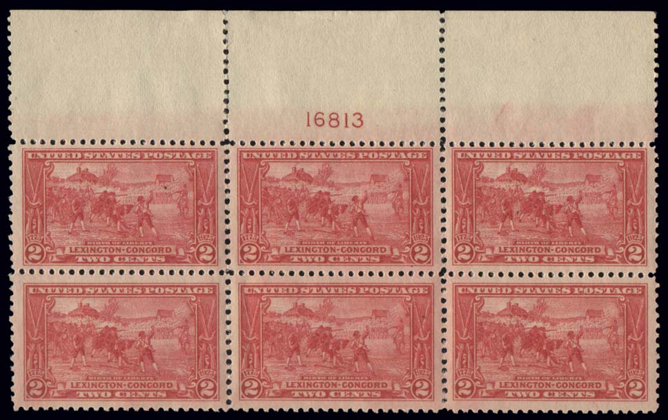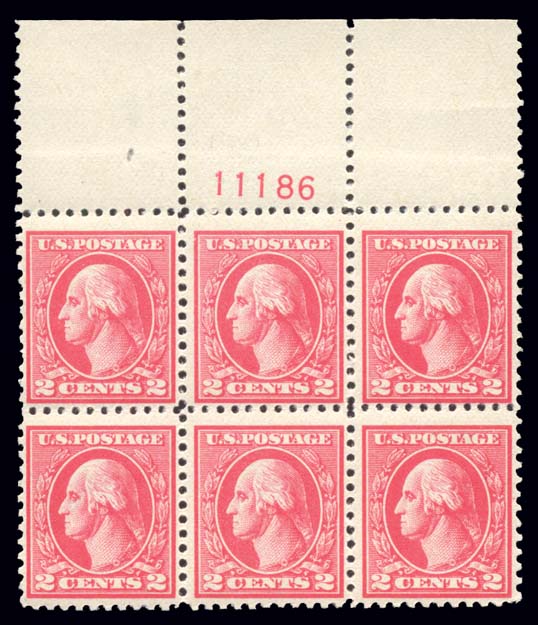 527,2¢ Carmine, Type V, Top Plate Block of 6 no. 11186, F-VF NH, perfs clear on all stamps, well-centered for issue Cat($350) (Image)