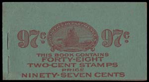 583a,2¢ CARMINE, PERF 10, COMPLETE 97¢ BOOKLET OF 8 PANES OF 6 #BK74 RED ON BLUE, F-VF NH, but all panes cut just into bottom frameline of bottom stamps, gum in excellent condition. Extremely scarce! Cat($2,250) (Image)