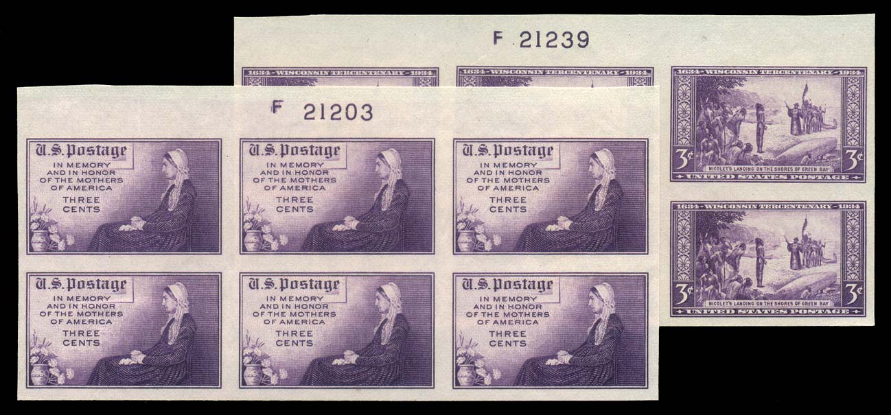 754-755,3¢ Mother's Day and 3¢ Wisconsin, Top Plate Blocks of 6 no. F 21203 and F 21239, VF-XF NG, as issued, choice! Cat($25) (Image)