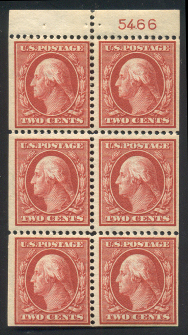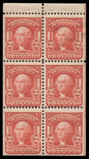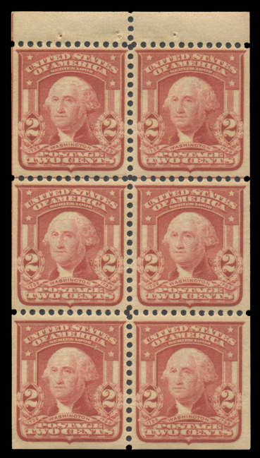 319g,2¢ Carmine, Ty I, Booklet Pane of 6, Pos. H with vertical line at right, F-VF OG Cat($125) (Image)