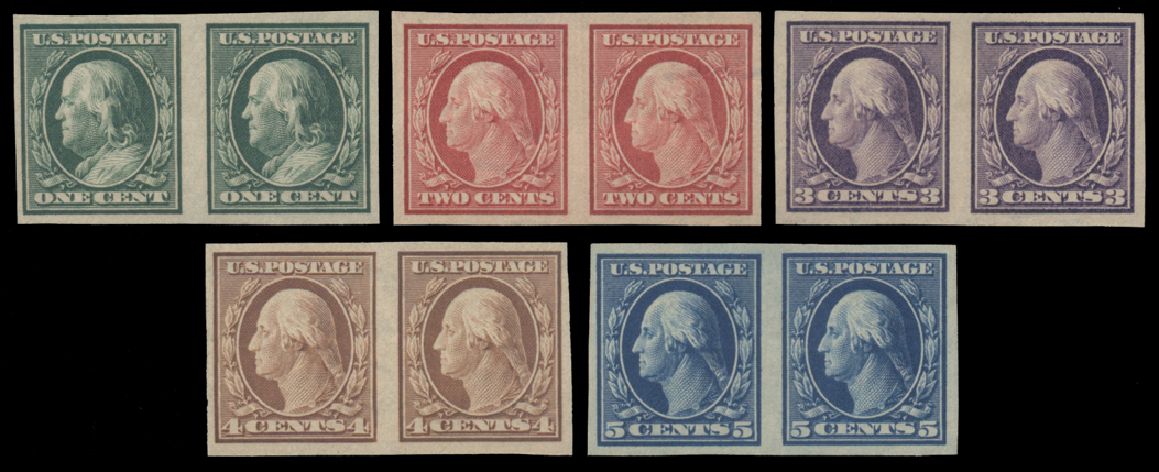 343-347,1¢-5¢ 1908-9 Washington/Franklin Heads, Horizontal Imperf Pairs, all VF NH to XF NH except 1¢ VLH on right stamp. Also, 2¢ with natural gum crease in right stamp. Beautiful set Cat($239) (Image)