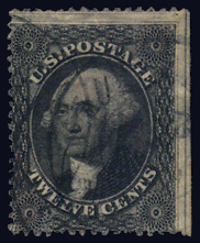36B,12¢ Black, Plate 3, Avg, with three cds ccls, natural SE at right with the "cutline" present, therefore being Pos. #20L3, 30L3...100L3, as part of the next stamp above is visible in the top perfs Cat($225) (Image)