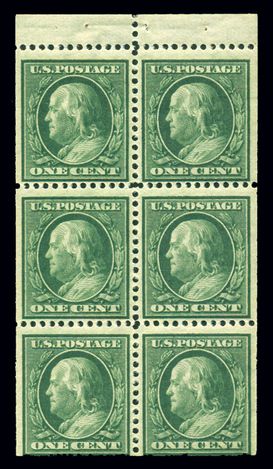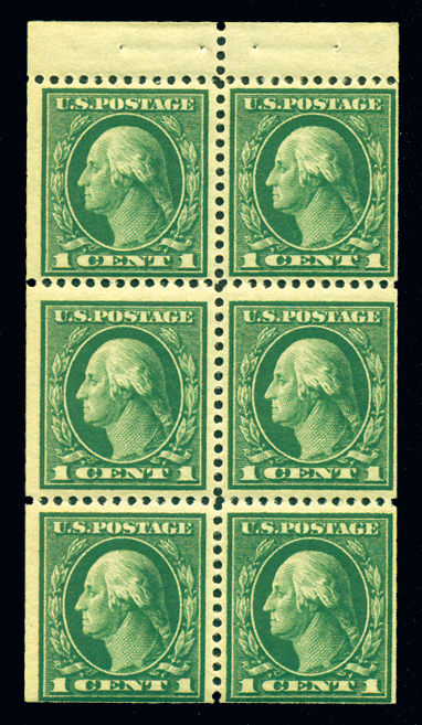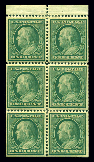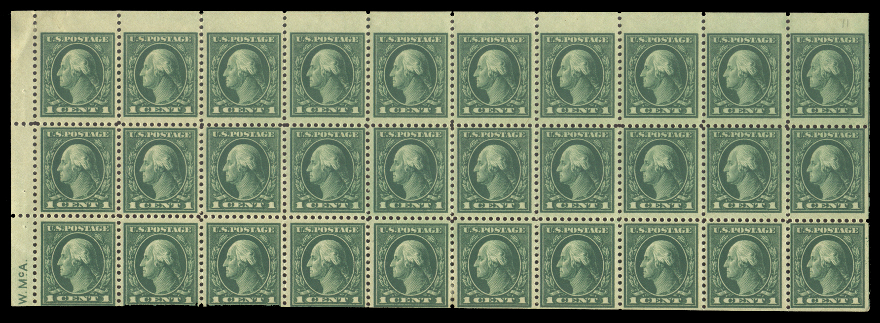 498f,1¢ Green, AEF Booklet Pane of 30, Pos. 11 with Initials "W. McA." in lower left tab and vertical line at right, Fine OG, 1973 APEX certificate Cat($1,050) (Image)