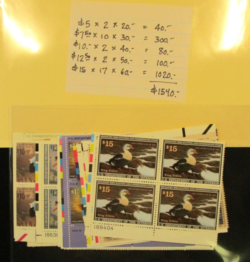 Sizable Federal Duck MNH Plate Block Accumulation - 33 MNH plate blocks of 4, face values range from $5 to $15. All MNH, with a few duplicates. Get them before they head south! (Face $1540) (Image)