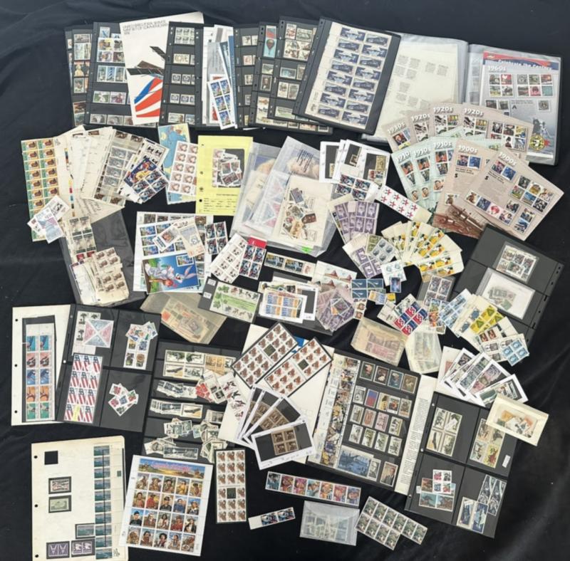 A USA face value dealer stock in 5 dealer books, all identified. Includes #2003/#2072 (#2006-#2009 blocks of 4 (2), #2016 PB, #2032-#2035 'doubling' block of 4, with two examples of #2043 with misplaced tagging, #2138-#2141 blocks of 4 (4), #2163a, one example of #2072 colours partially missing). #2073/#2400 (#2082-#2085 blocks of 4 (2), #2098-#2101 blocks of 4 (2), #2116 booklets (2), #2201a booklet, #2209a strip of 5, 2209a booklet, 2223a block of 4, 2238a block of 4, #2243a block of 4, #2274a strips of 10 (3), #2274 booklets (2), #2286-#2335, #2351-#2354 blocks of 4 (4), #2355-#2359 strips of 5 (2), #2362-#2366 panes of 5 (3), #2362-#2366 booklet, #2375a block of 4, #2385a strip of 5, #2390-#2393 blocks of 4 (3), #2405-#2409 strip of 5, #2408a booklet, #2419, #2433, #2438, #2474av pane of 5, #2484av-#2488av panes of 10, #2492b booklet. #2073/#2400 with #2116 bookets (2), #2201a booklet, etc. Total face- $692 plus 206 Forevers. Loads of material throughout worth much more than face. (Image)