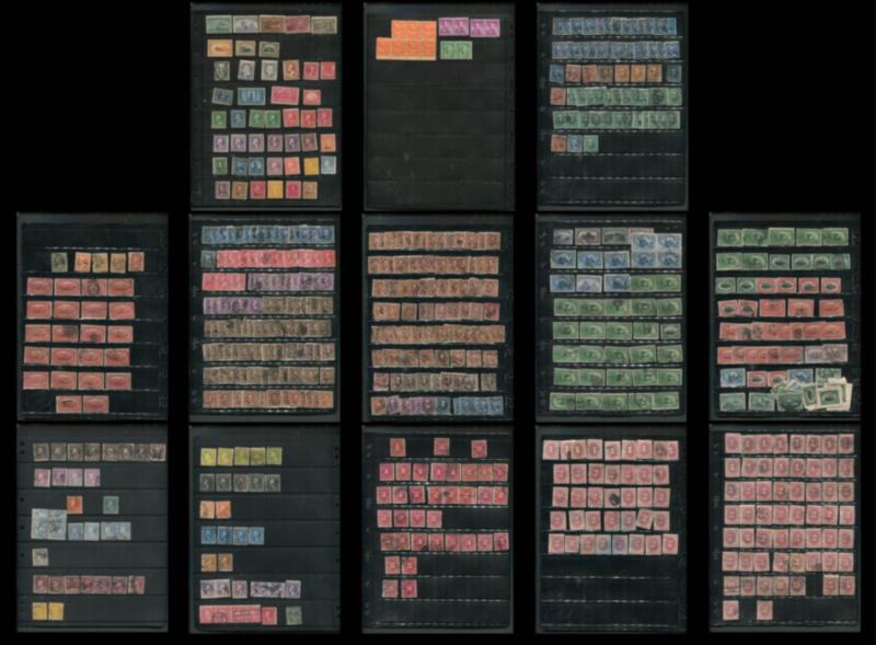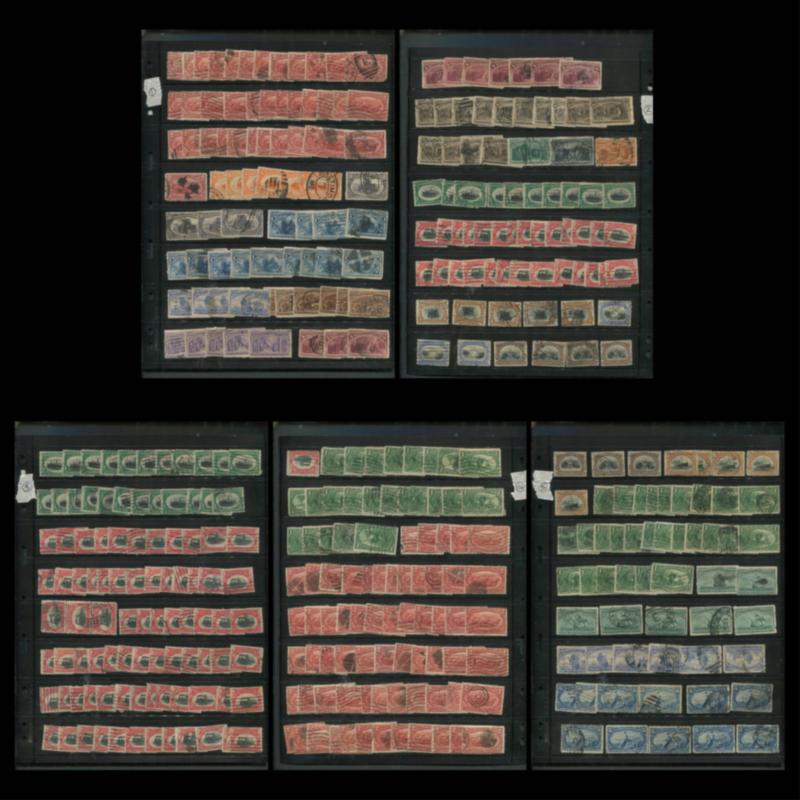 A used duplicated Columbians, Trans Mississippi and Pan Ams grouping from 1893-1901 #230/#299 neatly laid out on 3 double sided stocksheets. Includes #286 (100), #287 (6), #290 (4), #230 (13), #233 (10), #234 (6), #235 (5), #236 (10), #237 (14), #238-#240, #294 (33), #295 (100), #296 (5), #297 (3), #298 (7), #285 (50), #299 (5), #232 (7), #288 (11). Overall, at least fine throughout. Total Scott- $2,933. (Image)