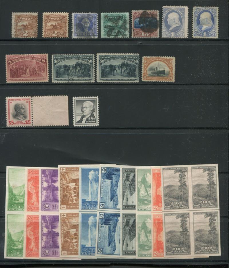 USA 1869-1956 #113/#1053 Mint/Used, neatly laid out on a stock sheet. Includes mint #113 (small gum loss spot at top), #236, #834 (very minor gum loss spot), #1053. Used #113, #115, #117 straight edge at left, #119, #240 (2). Unused NG #156, #156 fault (NC), #299 (creased, NC), #756-#765 blocks of 4 with 5c, 6c, 9c and 10c with lines in between. Total Scott- $1,755. (Image)